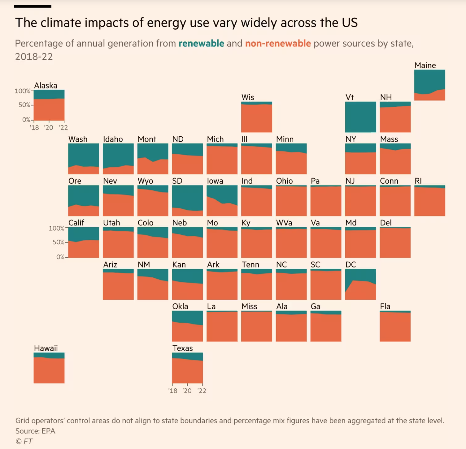 - 지역별 패턴: 북동부 및 북서부 주에서는 일반적으로 남동부 및 일부 중서부 주에 비해 재생 에너지 비율이 더 높습니다.