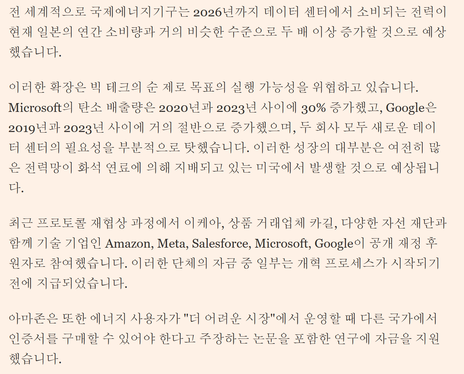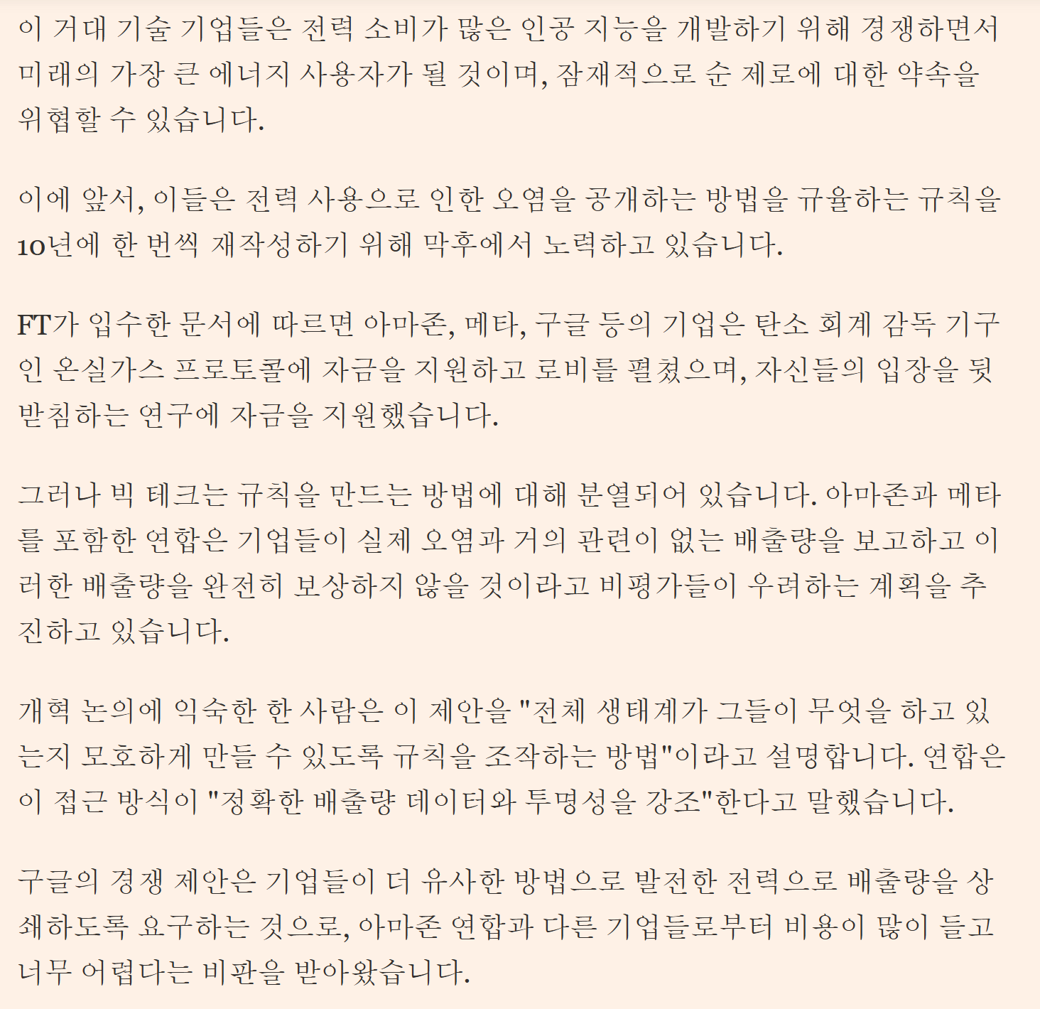 - 기술 발전과 에너지 사용: 인공지능 개발로 인해 데이터 센터의 에너지 사용이 급증하고 있으며, 이는 대기업들의 탄소 중립 목표에 위협이 되고 있습니다.