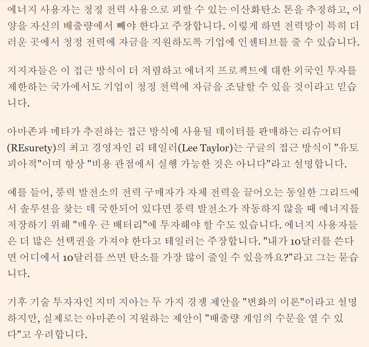 - 배출량 계산 논란: 아마존과 메타는 유연한 배출량 계산 방식을 지지하지만, 구글은 더 엄격한 기준을 요구하고 있습니다. 이는 비용과 실현 가능성에 대한 논쟁을 일으키고 있습니다.