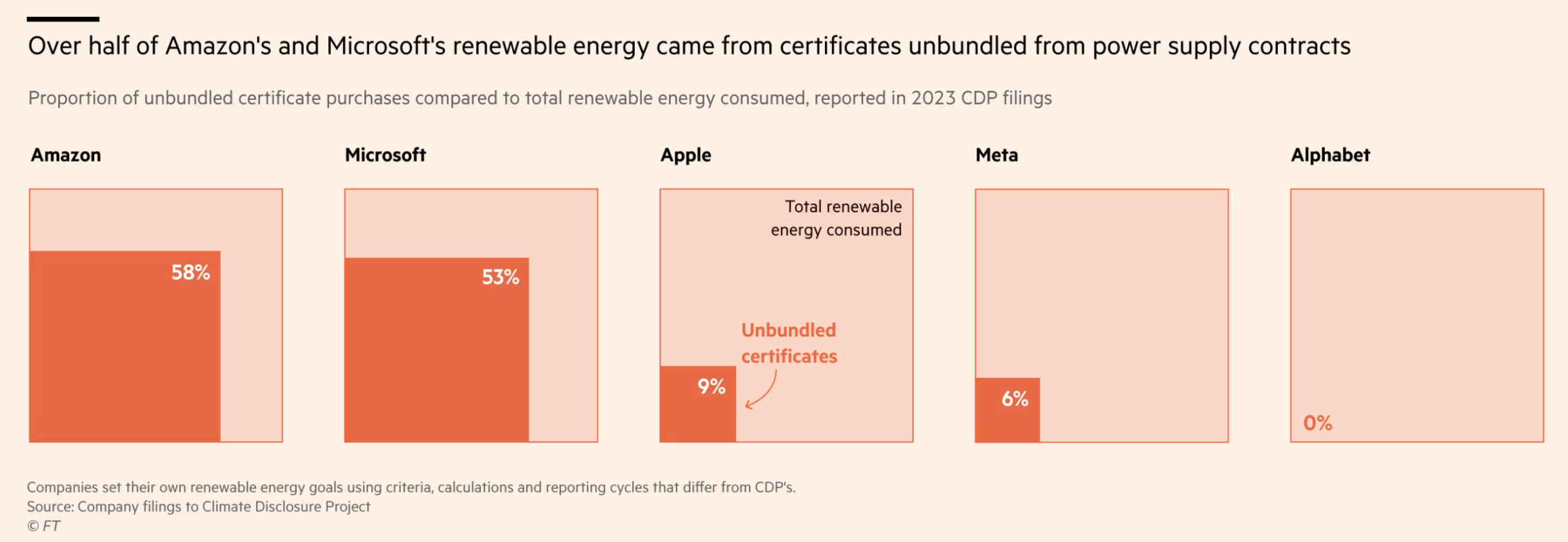 이 데이터에 따르면 Amazon과 Microsoft는 다른 기업에 비해 번들되지 않은 재생 에너지 인증서에 더 많이 의존하는 반면, Apple, Meta, 특히 Alphabet 같은 기업은 재생 에너지 목표를 달성하기 위해 다른 방법을 사용하는 것으로 나타났습니다.
