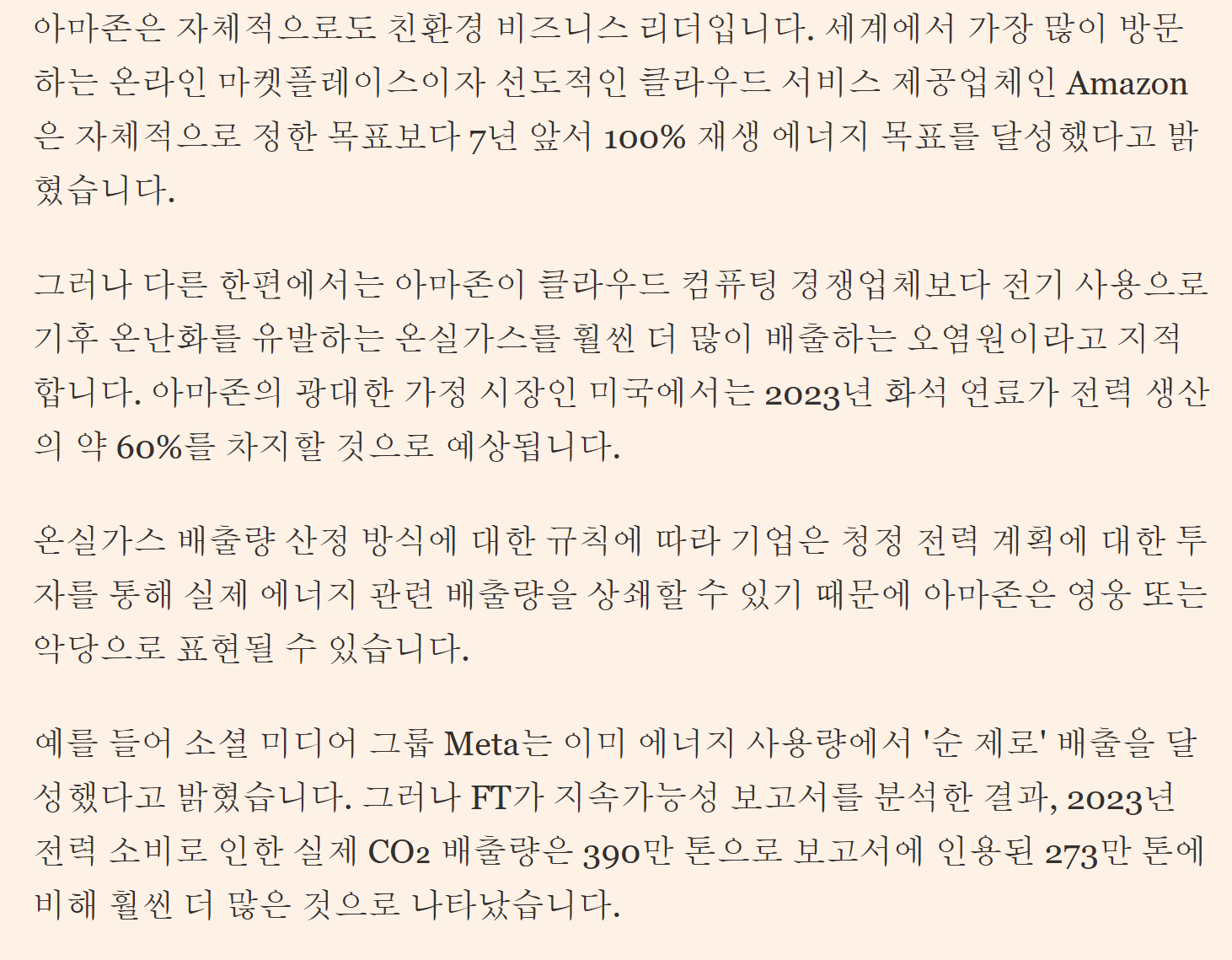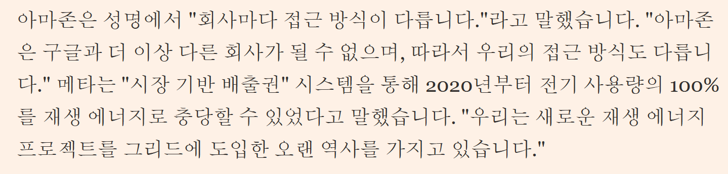 - 아마존: 아마존은 2023년 지속 가능성 보고서를 통해 지난 10년간의 지속 가능성 진전을 기반으로, 2040년까지 사업 전반에서 탄소 중립을 달성하기 위한 커밋먼트를 발표했습니다. 이들은 재생 에너지 인증서(RECs)를 통한 배출량 상쇄 외에도 효율적인 데이터 센터 설계와 환경 친화적인 서비스를 제공하고 있습니다.