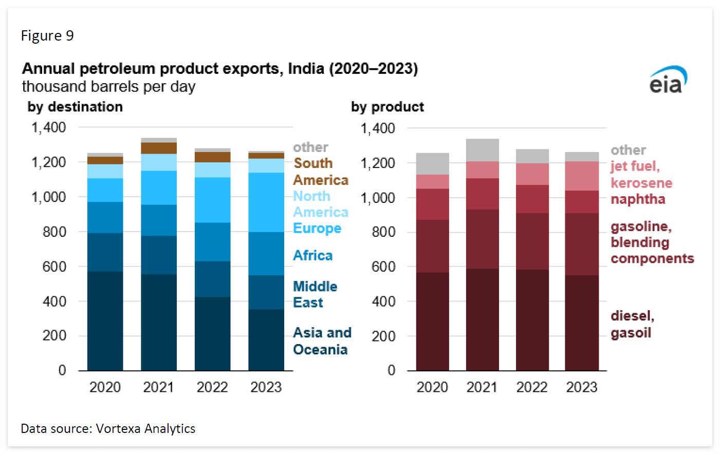 2022년 러시아의 우크라이나 침공이 본격화된 이후 중동에서 유럽으로의 수출이 증가했습니다. 그러나 대서양 분지의 기존 정유 설비가 상당하고 멕시코와 나이지리아에서 추가 설비가 가동되고 석유 제품 소비 증가세가 둔화됨에 따라 중동에서 대서양 분지 내 목적지로의 수출은 경쟁이 심화될 것입니다. 그러나 유럽의 정유 공장 폐쇄 가능성은 이 지역이 중동으로부터의 수입을 계속 유지할 수 있음을 시사합니다.