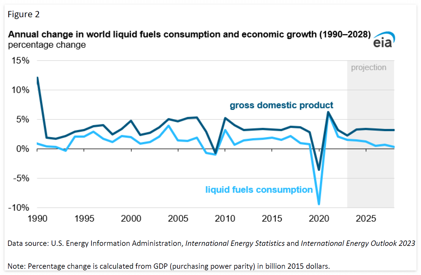 이 이미지는 "세계 액체 연료 소비와 경제 성장의 연간 변화 (1990–2028)"를 나타내는 선 그래프입니다. 이 그래프는 두 가지 주요 지표의 연간 변화율을 보여줍니다: **국내총생산(GDP)**과 액체 연료 소비입니다.