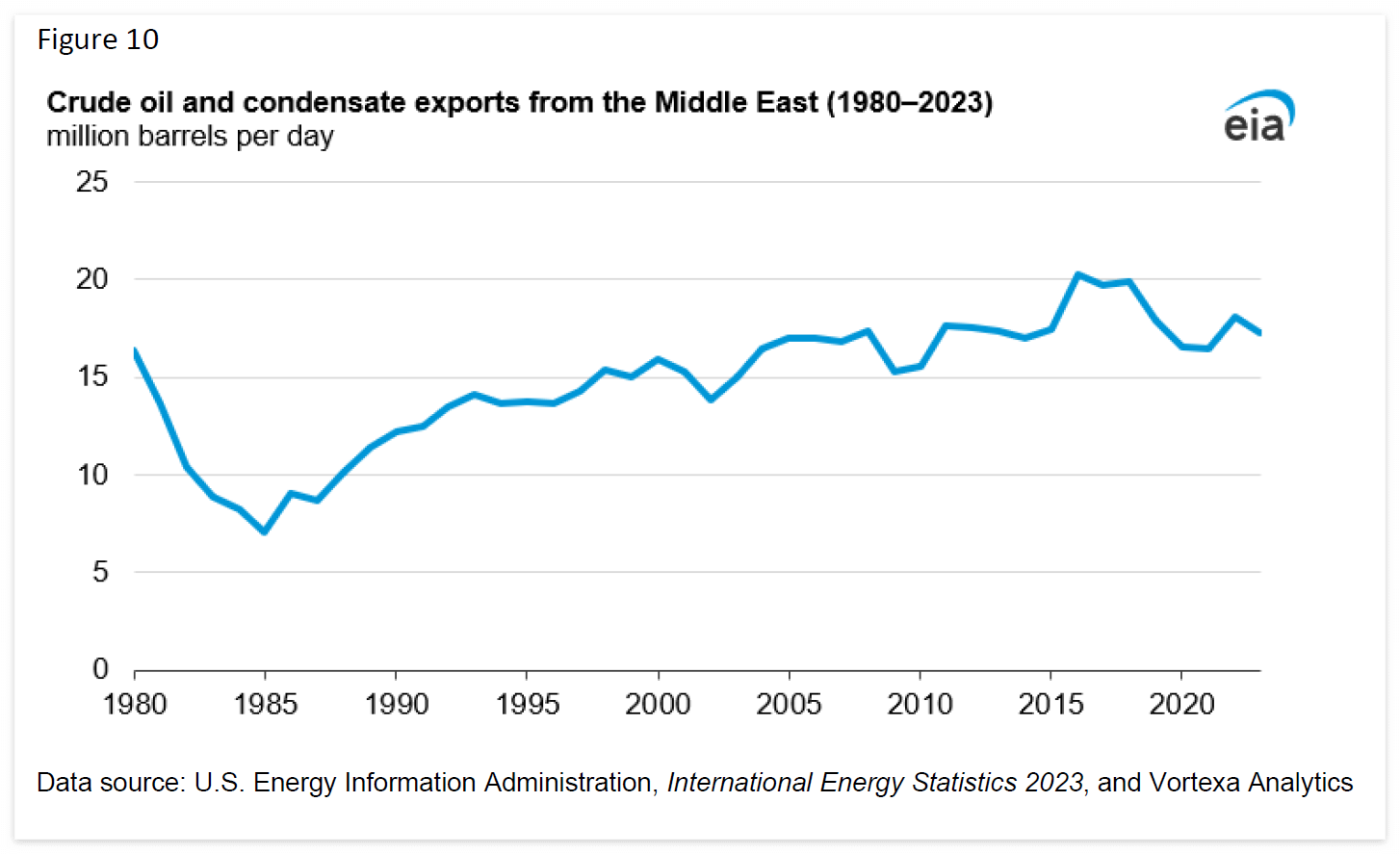 이 이미지는 "중동 지역에서의 원유 및 콘덴세이트 수출량 (1980–2023)"을 나타내는 선 그래프입니다. 이 그래프는 1980년부터 2023년까지 중동 지역에서 수출된 원유 및 콘덴세이트의 양을 하루당 백만 배럴 단위로 보여줍니다.