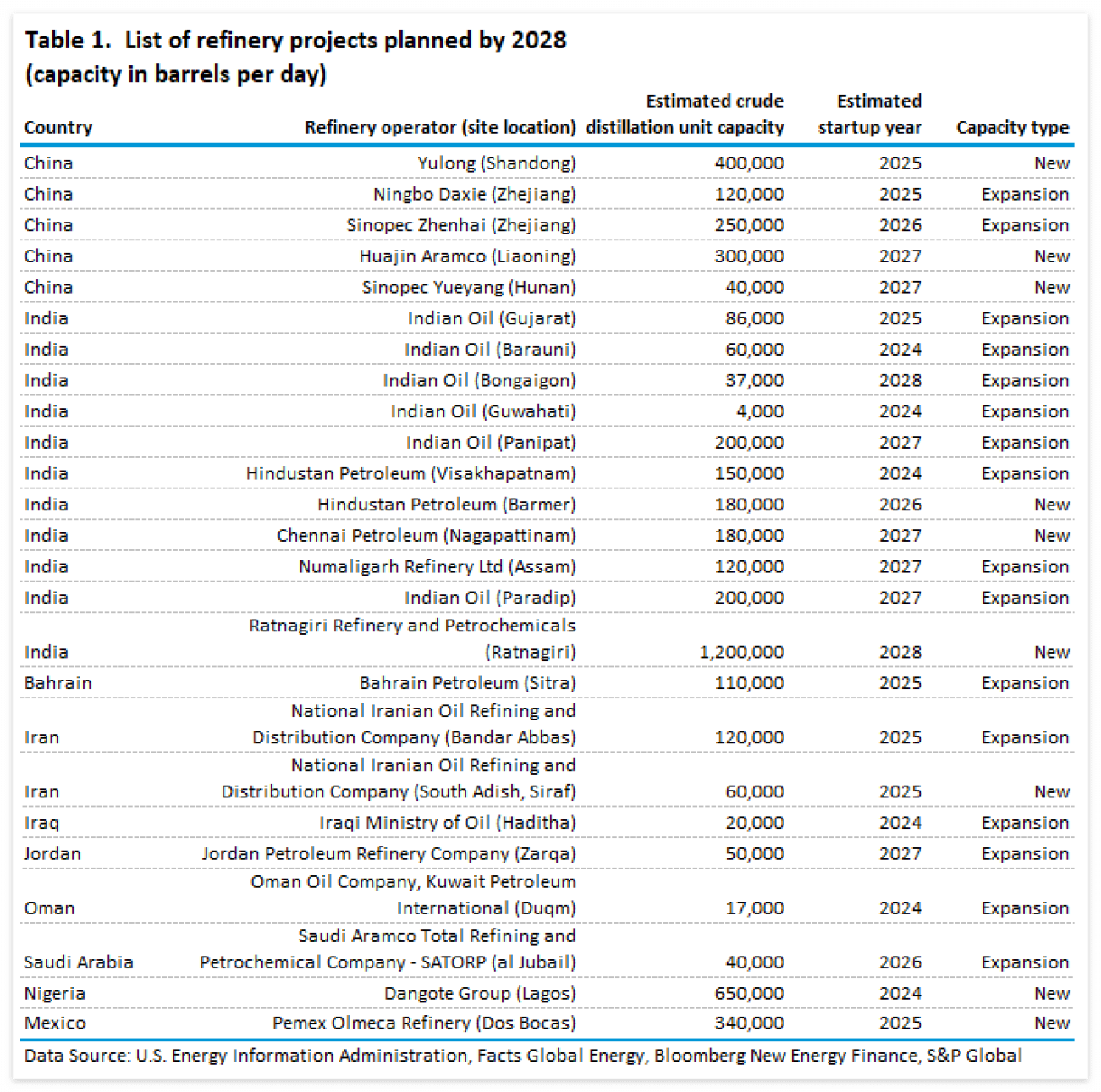 이 분석은 프로젝트 발표를 바탕으로 향후 4년 이내에 가동될 것으로 예상되는 프로젝트에 대해서만 논의합니다. 모든 정유 프로젝트에는 내재된 불확실성이 있기 때문에 2028년까지 다양한 용량이 가동될 수 있을 것으로 예상합니다. 정유 프로젝트는 자금 조달, 원유 공급 계약, 물류, 유닛 테스트, 운영 재고 비축 및 신규 시설의 가동을 복잡하게 만드는 기타 요인으로 인해 정기적으로 지연됩니다.