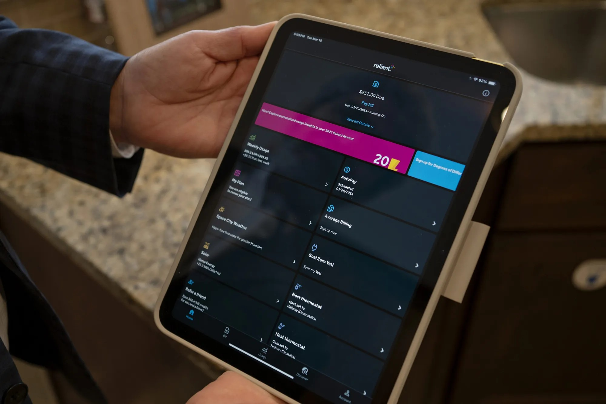 이러한 제어 장치는 일반적으로 독립형 가젯으로 소비자에게 판매되지 않습니다. 대신 축전지, 태양열 시스템 구성 요소, 온도 조절기 등에 내장된 기능을 기반으로 합니다. 휴대폰이나 태블릿의 앱을 무선으로 연결하면 집주인이 가정 에너지 시스템의 작동 방식을 설정할 수 있으며, 예를 들어 여름철 에어컨 수요가 많은 시간대에 원격으로 온도조절기를 1도(0.6℃) 올릴 수 있습니다. 태양열과 배터리가 있는 집의 경우, 이 시스템을 통해 집주인이 전력을 전력망에 판매하여 공공요금 크레딧을 받거나 일부 서비스 제공업체로부터 돈을 받을 수도 있습니다. 이 앱은 또한 3월 휴스턴의 유틸리티 업체인 NRG Energy가 선보인 스마트 홈 투어에서처럼 여러 회로에서 사용되는 전력량을 추적하고 제어하는 스마트 차단기 패널뿐만 아니라 스마트 가전제품을 연결할 수도 있습니다.