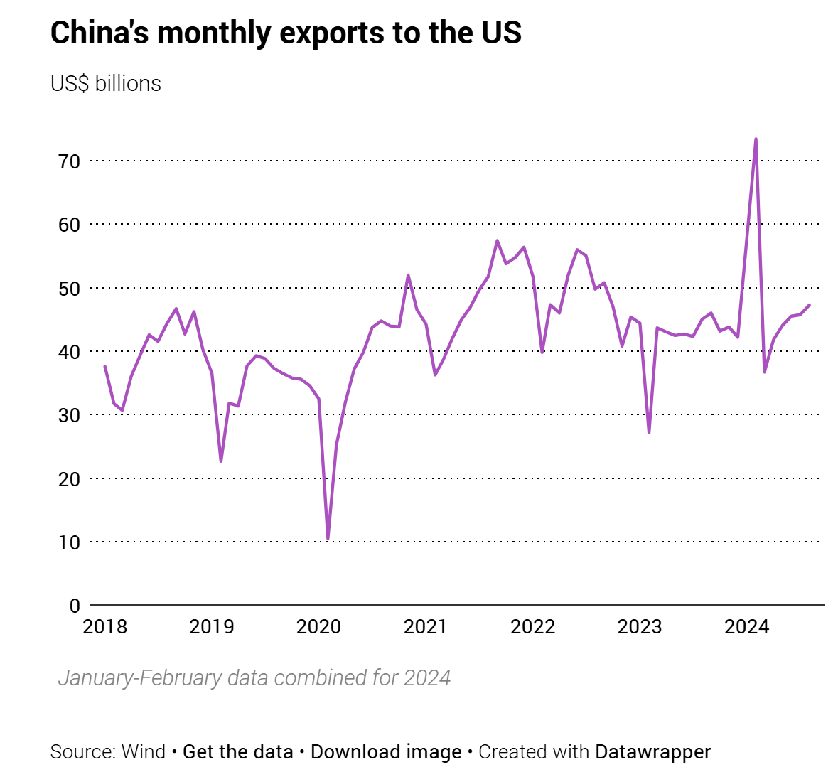 차트는 **“중국의 대미 월별 수출”**을 나타내고 있습니다. 세로축은 미국 달러(US$) 억 단위로 표시되며, 가로축은 2018년부터 2024년까지의 기간을 나타냅니다. 차트는 월별 수출액의 변동을 보여주며, 특히 데이터의 마지막 부분에서 급격한 증가가 눈에 띕니다. 2024년 1월과 2월의 데이터는 합산되어 표시됩니다. 데이터 출처는 Wind입니다.