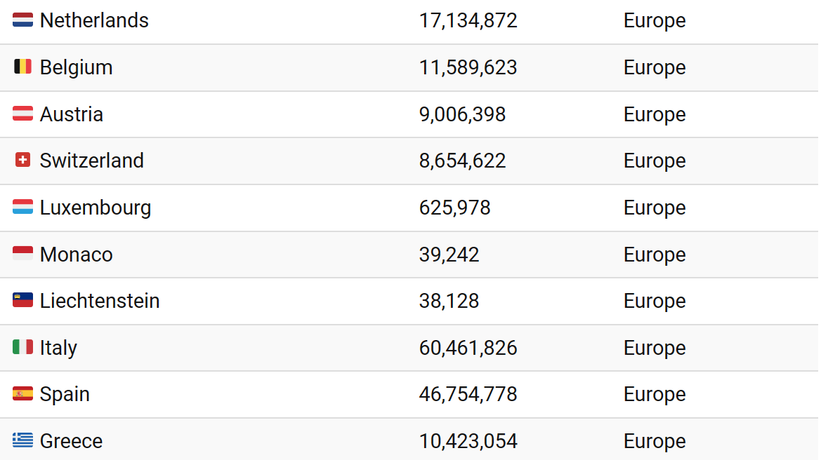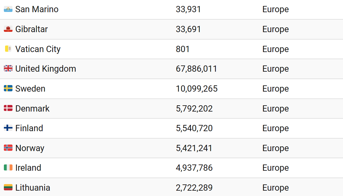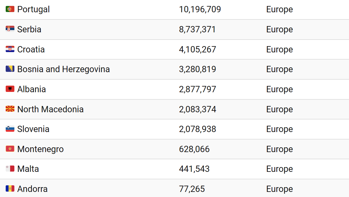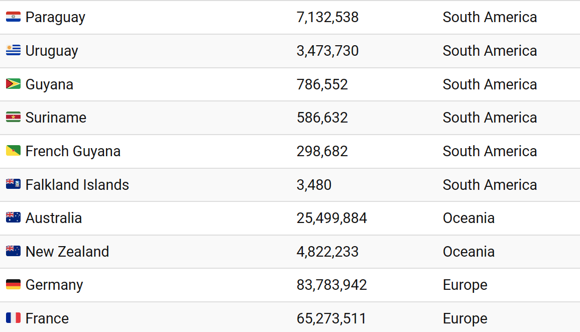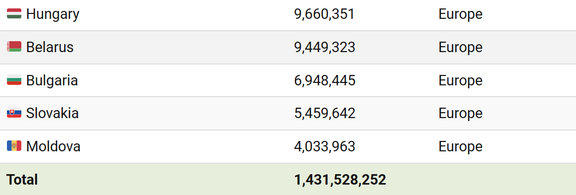 다음은 전 세계 다양한 지역의 65개국 인구이며, 이를 모두 합쳐도 여전히 중국 인구에 미치지 못한다는 것을 알 수 있습니다: