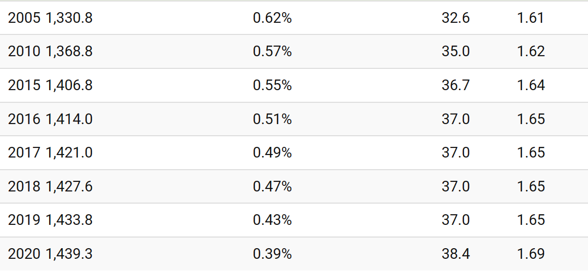 중국의 인구 증가가 둔화되고 있는지 여부는 중국의 규모를 고려할 때 그다지 중요하지 않은 것으로 보입니다. 2026년에는 인도가 중국의 인구와 비슷해질 것으로 예상되지만, 중국은 이에 관계없이 세계 최대 경제 대국 중 하나로 남을 것입니다. (현재 인도의 인구가 중국을 앞질렀습니다.)