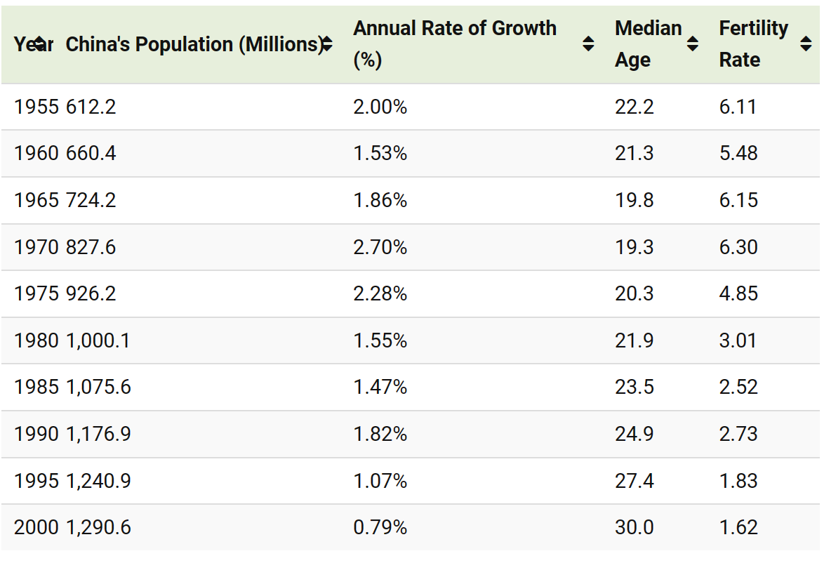 출산율은 1955년 여성 1인당 6명 이상에서 2020년 1.69명으로 지속적으로 감소하고 있습니다. 현재 중국의 평균 연령은 38세로 1955년의 22세에서 상승했습니다. 수명이 길어지고 출생아 수가 줄어드는 인구통계학적 추세는 사회적, 경제적으로 많은 영향을 미칩니다.