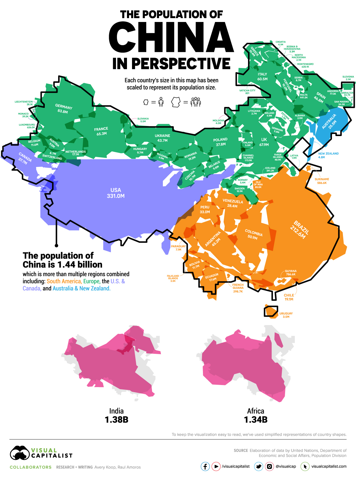 이 색다른 맵은 유엔의 데이터를 사용하여 중국 인구의 규모를 다른 여러 국가와 비교하여 보여줍니다.