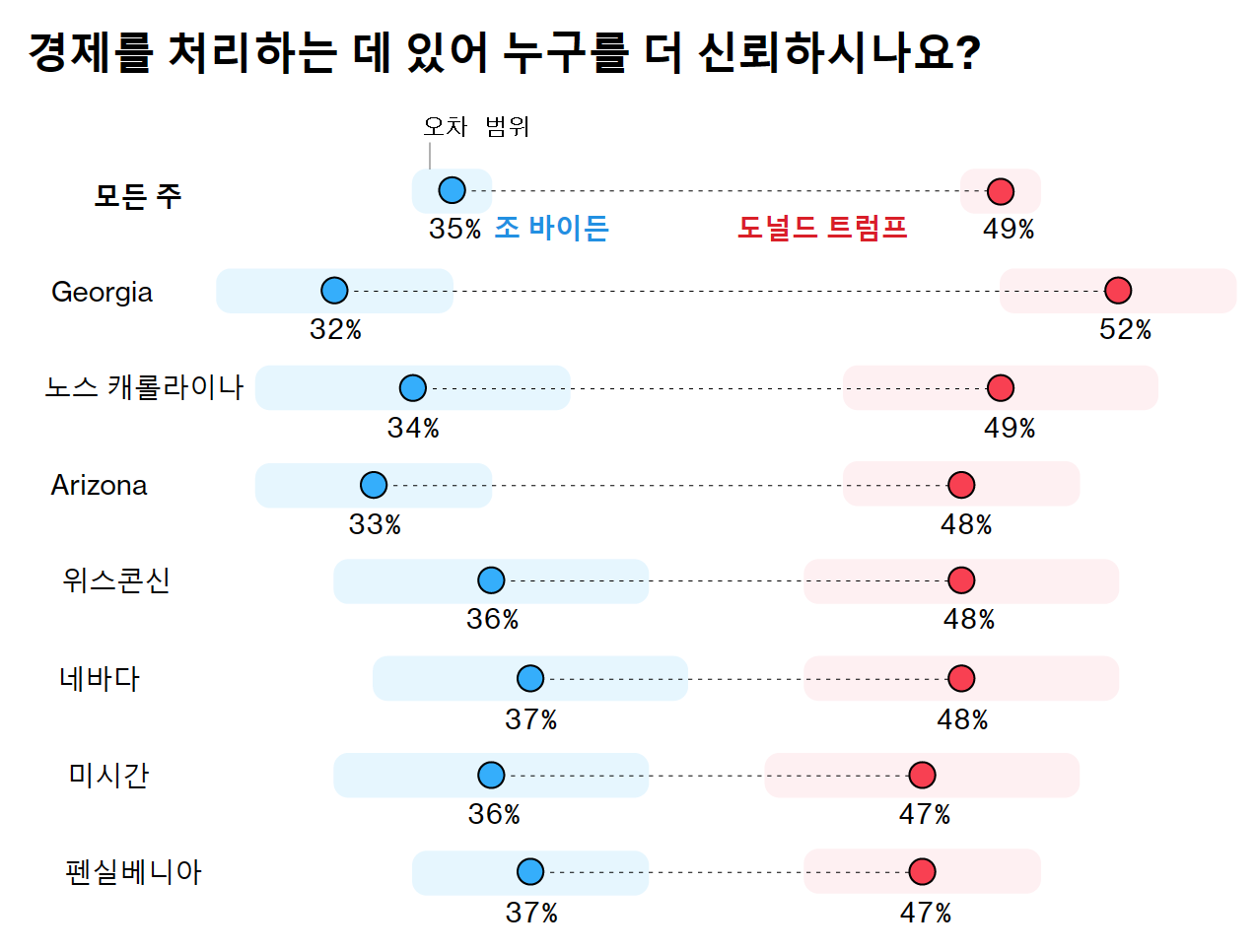 - 트럼프 전 대통령이 바이든 현 대통령을 경제 문제에서 더 신뢰받고 있으며, 7개 주 중 5개 주에서 약간의 리드를 보이고 있습니다. 하지만 모든 주에서 오차 범위 내에 있습니다.